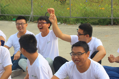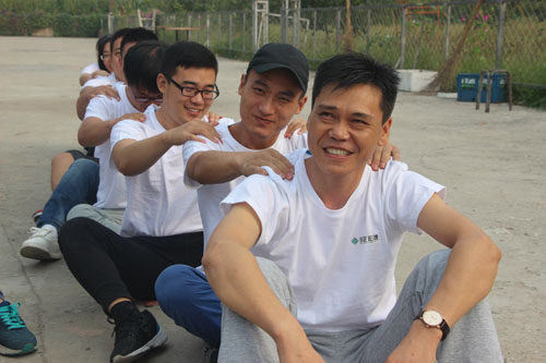 大家分成兩組坐在地上,為自己前方的人捏肩捶背,然后轉(zhuǎn)身向后輪換。游戲迅速消除了員工們的陌生感,營造了很好的拓展氛圍,奠定了團隊建設(shè)的基礎(chǔ)。